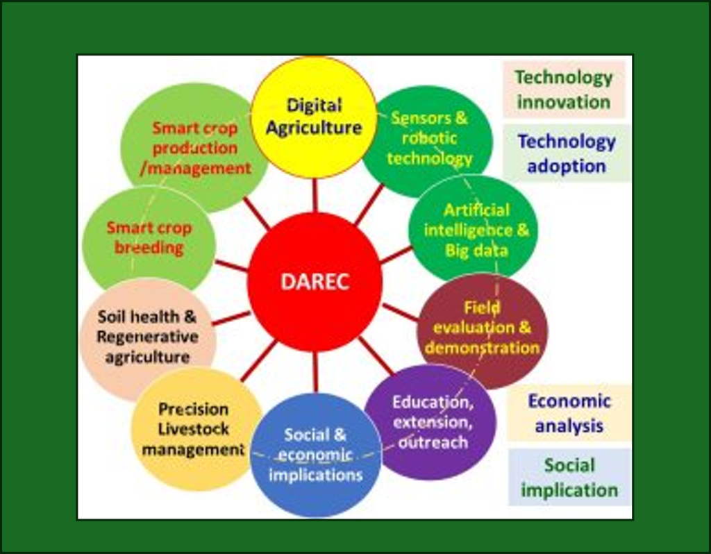 DAREC’s mission includes pioneering research in digital agriculture using technologies like AI and IoT, providing advanced educational programs for students and professionals, and serving as a knowledge hub through outreach and extension services. This approach aims to enhance agricultural productivity, foster a skilled workforce, and extend the benefits of digital agriculture globally.